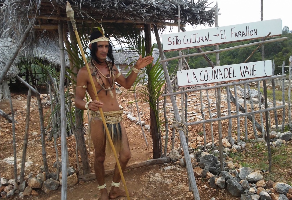 El joven, caracterizado como un aborigen cubano, recibe a los visitantes que llegan a las lomas a ver lo que allí tiene montado.