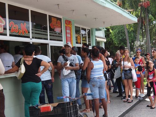 A los clientes molesta igualmente la “indicación” de que sólo se puede vender el refresco si se consumen salchichas (una política que recuerda los famosos “convoyados” de los años 80 del siglo pasado). Esta medida puede resultar lógica para evitar el acaparamiento de refrescos por parte de los comerciantes particulares, pero no tendría razón de ser si el Estado cubano lograra la estabilidad de los refrescos enlatados en el mercado.