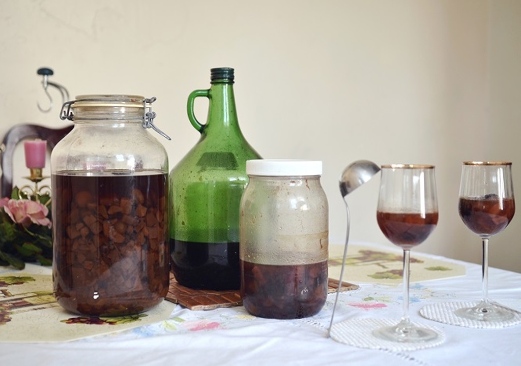 La mezcla (a la que se le añade alcohol y se somete a un proceso de cocción en almíbar) se deposita en un recipiente de cristal y se deja reposar durante varios meses. Posteriormente, cuando ya ha adquirido un sabor característico, se le añaden trocitos de caña de azúcar. Al llegar los visitantes pues se les brindaba ésta deliciosa y algo fuerte bebida.