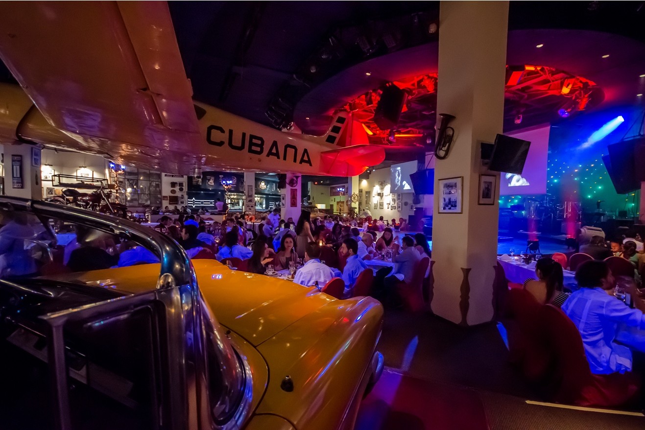 Habana Café, el único restaurante cubano que tiene dentro automóviles, motocicletas y hasta una avioneta colgando del techo