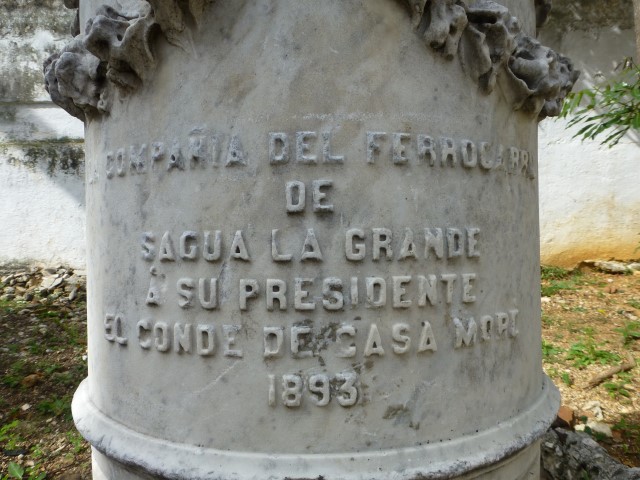 En mármol blanco de Carrara fue inmortalizado el Conde de Casa de Casa Moré. Su pedestal en forma de columna estilo dórico se remata con un capitel compuesto por anillos, unos impecablemente lisos y otros con talladuras preciosas; al frente del pedestal, tallado en alto relieve se lee la siguiente inscripción: “La Compañía del Ferrocarril a su Presidente el Conde de la Casa Moré, 1893”.