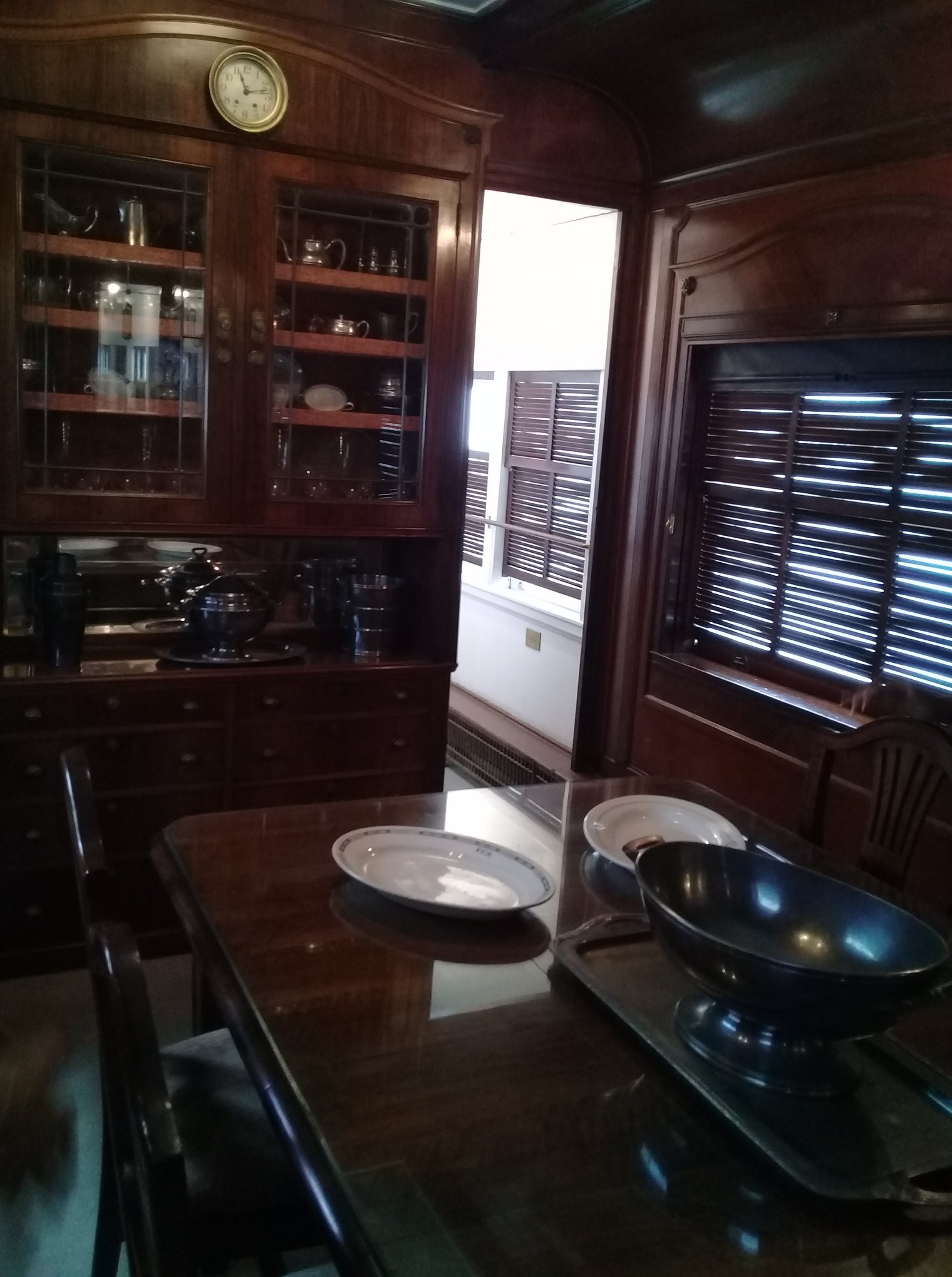 Con mesa para ocho comensales, el comedor exhibe, al lado de una caja fuerte, la vitrina de cristal blanco traslúcido en donde se guarda vajilla y cubertería de plata del Coche Mambí. Utensilios de todo tipo ostentan el monograma que los autentica como objetos originales del vagón presidencial.
