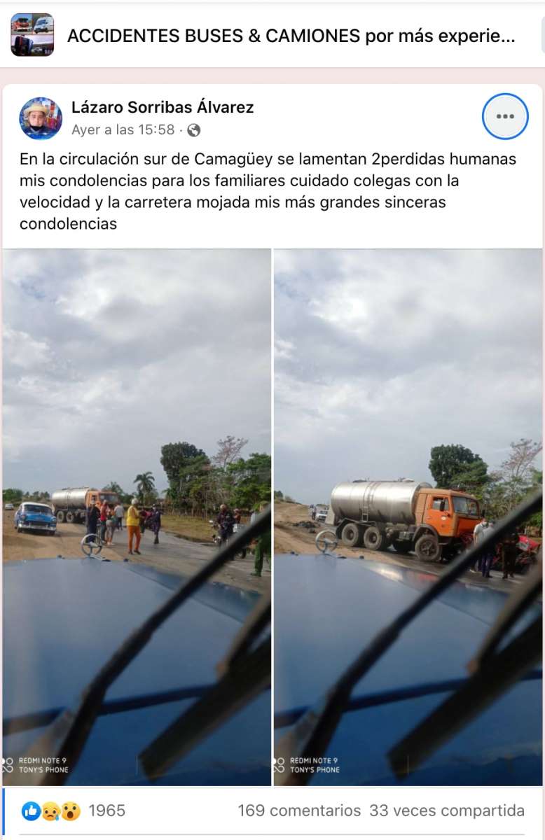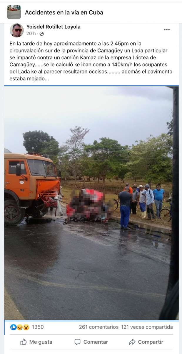 «Un Lada particular se impactó contra un camión Kamaz de la empresa Láctea de Camagüey… se le calculó que iban como a 140 km/h los ocupantes del Lada que al parecer resultaron occisos… además el pavimento estaba mojado…», explicó un internauta.