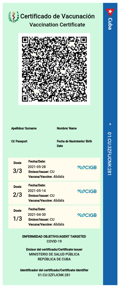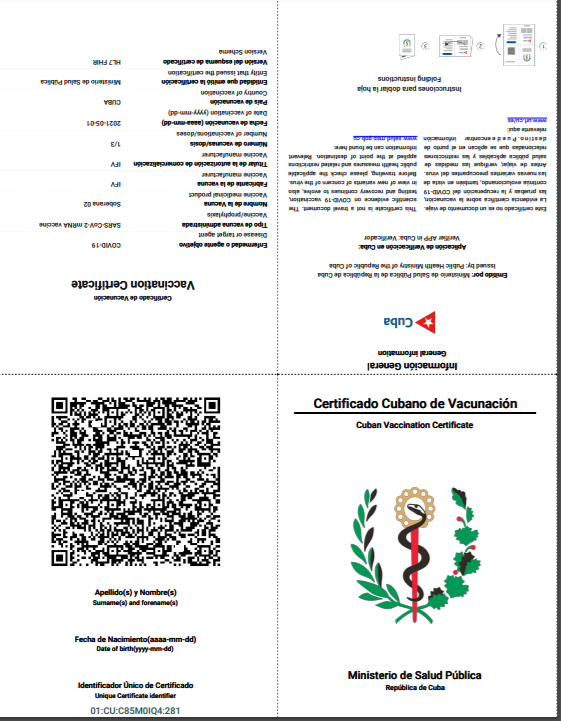 «Los certificados que se emitirán en el sistema cuentan con un código QR, con datos de identificación personal y de vacunación, todos firmados digitalmente. Considerándose una herramienta personal portable, segura y verificable», indica la propia página web del Minsap.