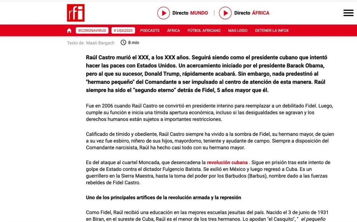 Radio Francia Internacional (RFI) cometió un equivicación al publicar un obituario dedicado a la muerte de Raúl Castro en sus redes sociales y luego retirarlo al reconocer que todo no fue más que un «error técnico».
